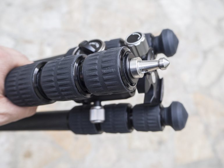 D’ailleurs un crochet sous la colonne centrale permet soit d’accrocher un accessoire soit d’y fixer un sac pour le lester. En plus, en fonction du terrain vous pourrez choisir entre les patins en caoutchouc montés de base avec le trépied ou si le sol est meuble les dévisser pour fixer des pointes en métal. Là encore bonne surprise, la base des pointes est sertie d’un joint torique qui évitent que des impuretés ne pénètrent dans les jambes. Un détail rare à ce prix.