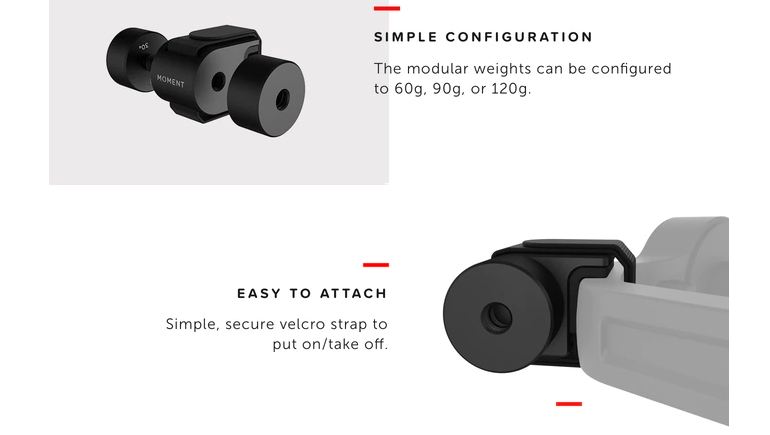 Un contrepoids permet d’éviter que les moteurs de votre stabilisateur ne forcent en cas de déséquilibre. Moment part du principe que pour réaliser des vidéos, la plupart des utilisateurs se servent d’un stabilisateur. Le fabricant propose donc un contrepoids dans sa collection d’accessoires.