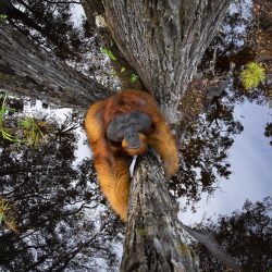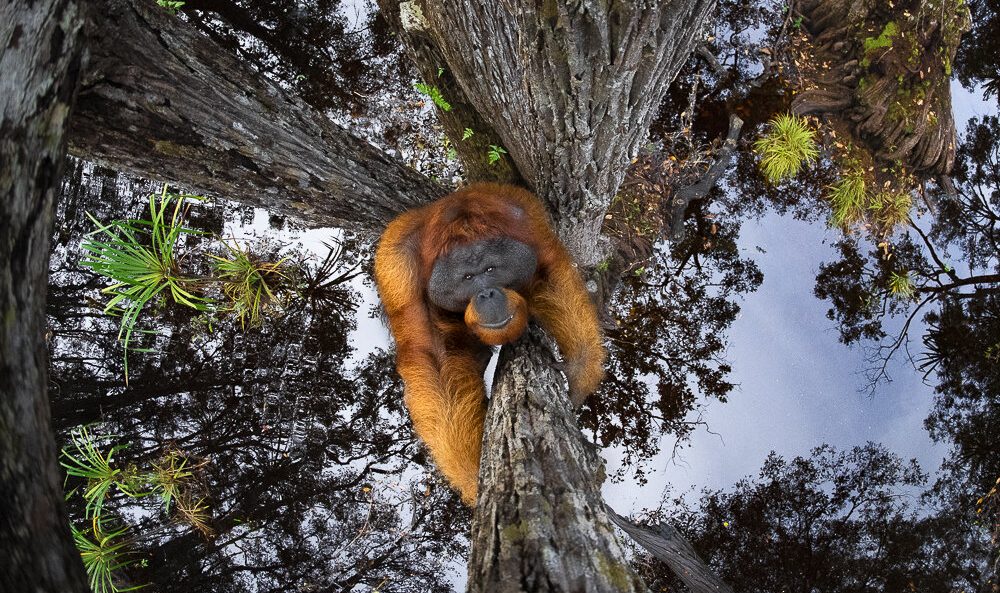 « J’avais ce cadre en tête, alors pour obtenir cette photo, j’ai d’abord choisi un arbre qui était dans l’eau afin d’obtenir un bon reflet du ciel, ce qui peut donner l’impression que l’image est à l’envers, puis j’ai grimpé sur l’arbre et j’ai attendu pendant des heures. Il s’agit d’un chemin que les orang-outan empruntent régulièrement pour se rendre sur une autre petite île, j’étais donc sûr d’obtenir cette image si j’attendais patiemment. J’ai donc attendu et attendu longtemps et finalement, j’ai obtenu ce magnifique cadre » explique le photographe.