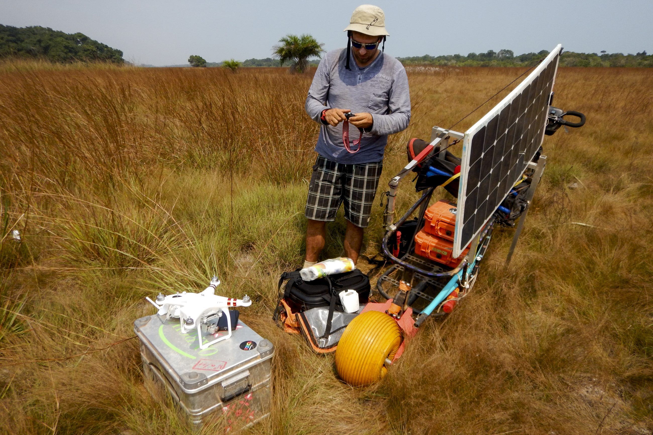 Grâce à mes précédents voyages, je savais qu’il me fallait deux boîtiers avec un objectif pour chacun pour ne pas avoir à changer d’objectif tout le temps. Le panneau solaire – notre seule source d’énergie – est identique à celui utilisé lors de notre précédent projet : « Iles Salomon », je connaissais donc bien sa production d’énergie. J’ai construit une caisse étanche dans laquelle il y avait le régulateur, une batterie et mes chargeurs. Il fallait que tous les appareils aient les mêmes batteries pour transporter le moins de matériel possible et pour alléger au maximum ma remorque. Elle pesait de 60 à 70 kg selon le remplissage des poches d’eau. Il est clair que si je n’avais fait que de la photo, mon chargement aurait été plus léger.