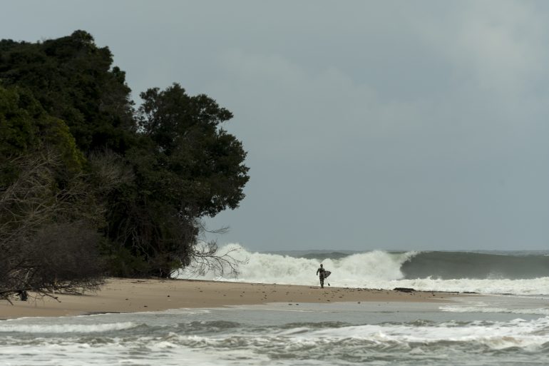 Globalement, je ne suis pas très content de mes photos. Je dirai celle-ci (ci-dessus) car elle illustre correctement notre rêve de surfeur pendant le trip. Je me rappelle très bien la scène : j’étais caché au milieu de la pointe du spot « Tarzoon », un pied dans l’eau, l’autre dans la foret. Cela faisait plusieurs heures qu’ Aurel et Ewen essayaient de prendre des vagues. Il y avait un courant important qui les a emmenés vers le nord, tout en bas de la pointe. Ils ont donc dû remonter toute la pointe en suivant les pistes d’éléphant, redescendre sur les bouts de plage, passer la pointe dans les rochers entre deux vagues puis continuer 200 m dans la baie au sud, se mettre à l’eau, passer un shorebreak violent (vague très puissante) et espérer prendre une vague avant de se faire emporter dans le courant. Tout cela dans les eaux les plus « sharky » du monde ! Pendant ces longues heures, on était tous les trois tout seuls, souvent à plusieurs centaines de mettre l’un de l’autre. Je ne les voyais plus dès qu’ils passaient la pointe, eux ne me voyais jamais tellement la végétation était dense !