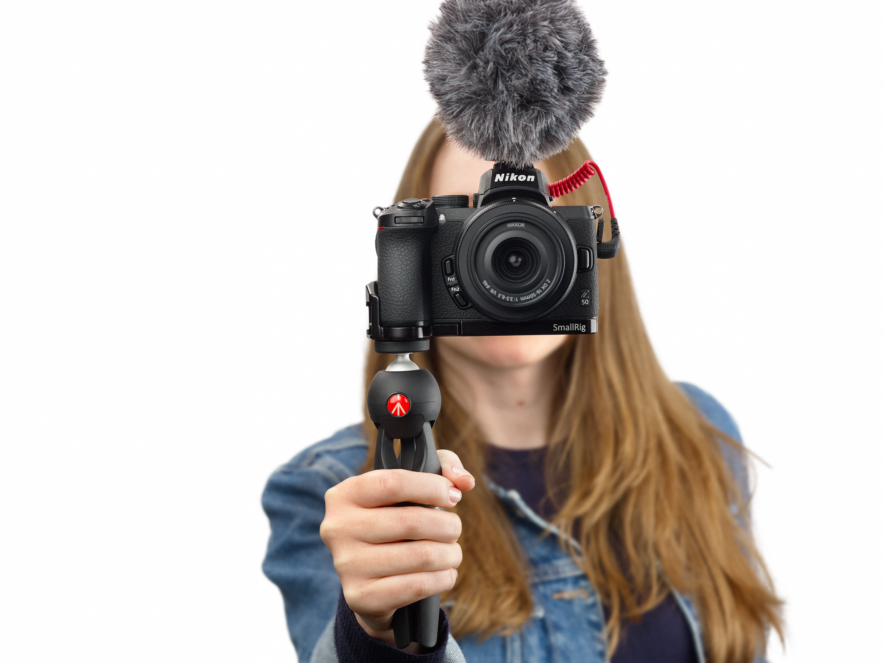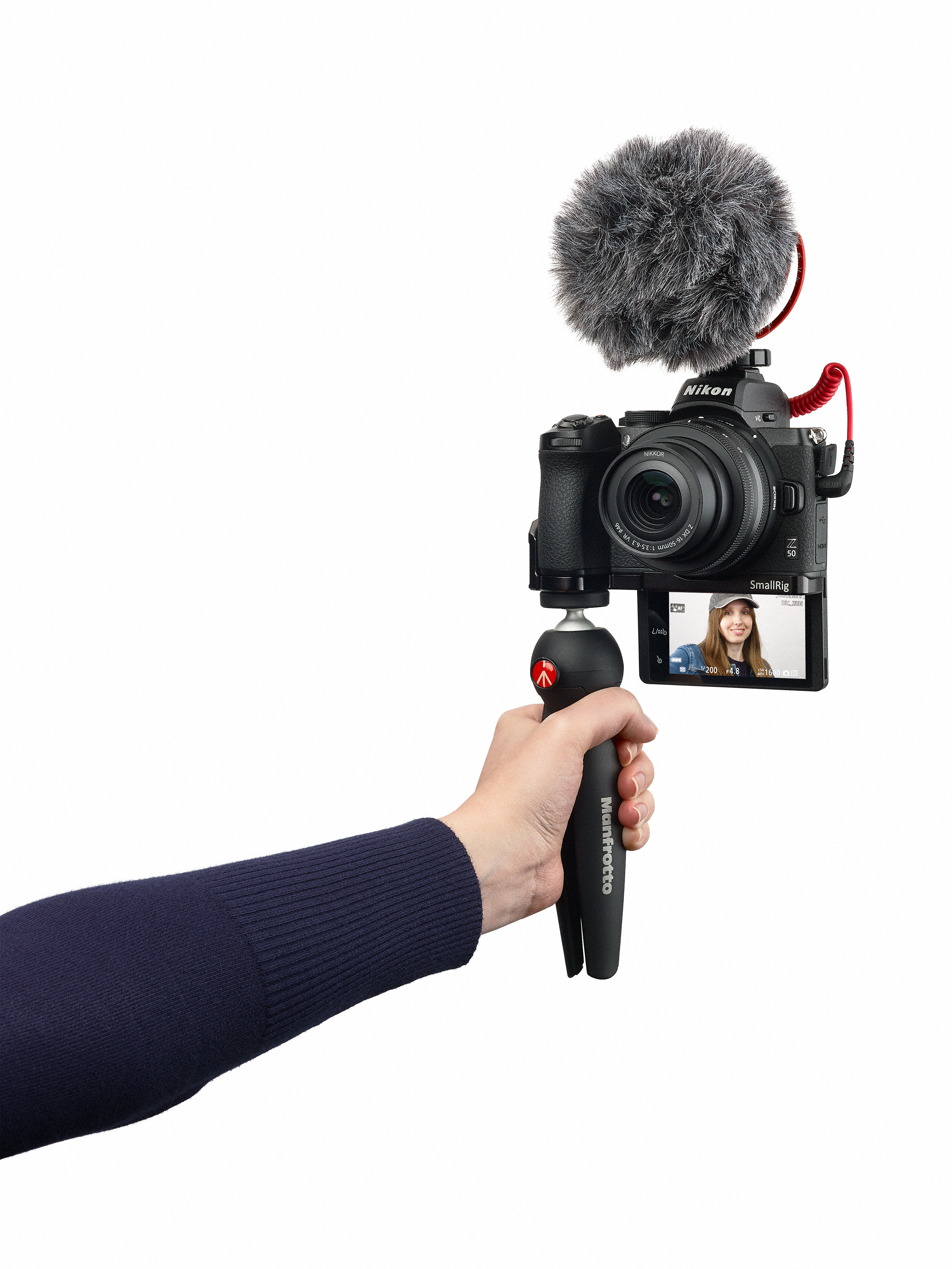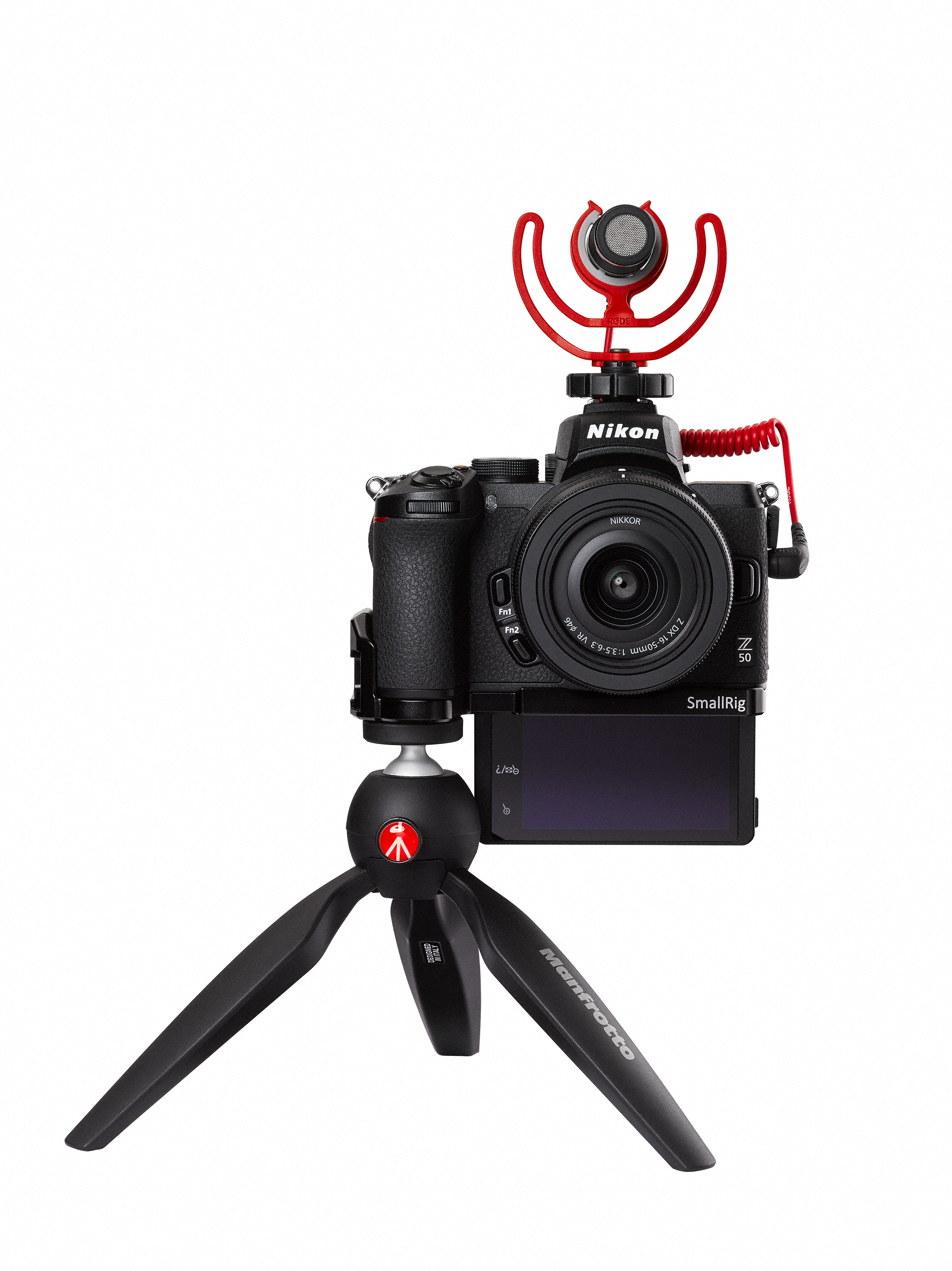 Dans le kit aujourd’hui officialisé par la marque nippone, Nikon propose évidemment son Z50, associé à l’optique pancake Nikkor Z DX 16-50 mm f/3,5-6,3 VR. Il se distingue notamment par sa compacité une fois replié, qui s’ajoute à celle du Z50, dont le poids d’ailleurs n’excède pas 450 grammes. Le pack inclut en outre le microphone Rode VideoMicro, alimenté par l’appareil photo et doté d’un câble jack amovible, mais aussi sa suspension Rycote Lyre qui permet l’ajout d’une bonnette anti-vent, utile lors des tournages en extérieur. Un mini-trépied Manfrotto MTPIXI-B, avec son support SmallRig autorisant une rotation verticale ou horizontale à 90°, s’ajoute à l’ensemble et peut être utilisé comme poignée au besoin.