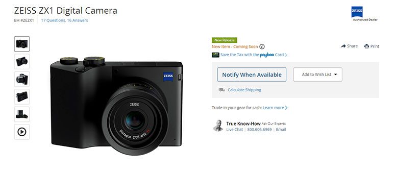 Cela ne remet pas en question l’imminence de la commercialisation de cet appareil, la mention « coming soon » étant rarement inscrite des mois à l’avance sur le site B&H. Le site dédié au Zeiss ZX1 (lien ci-dessous) en français propose d’ailleurs d’être tenu informé de la sortie de ce boîtier.