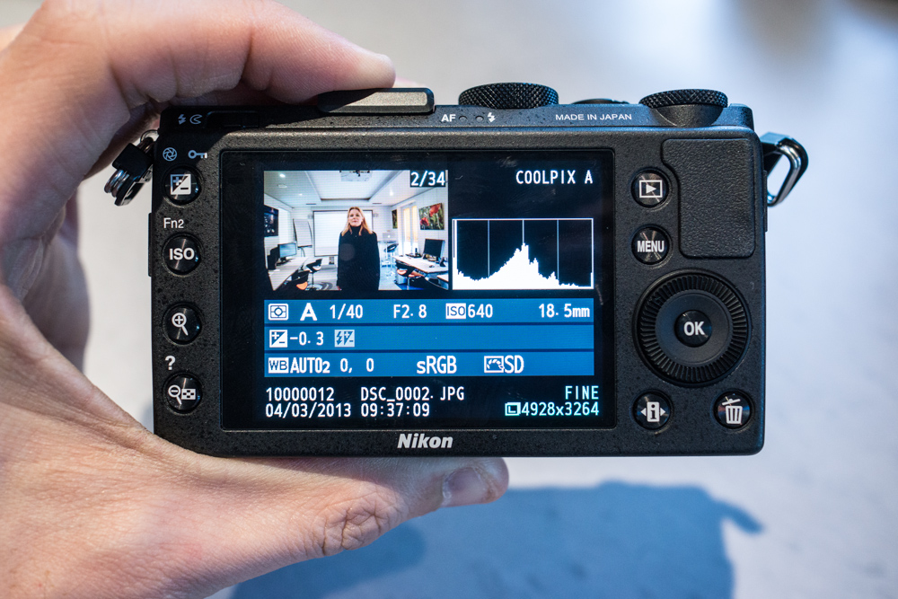 L’arrière est également une bonne surprise : on reprend certains codes du reflex avec notamment les touches à gauche de l’écran. A droite, cela ressemble plus à un compact. Au milieu, on retrouve toute l’ergonomie et les menus des reflex Nikon. Autant vous dire que c’est une très bonne idée.