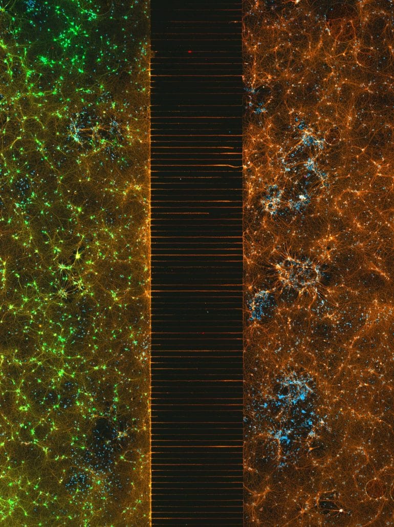 La deuxième place de la compétition de microphotographie a été attribuée à Esmeralda Paric pour son image d’un dispositif microfluidique contenant des centaines de milliers de neurones en réseau. Les neurones primaires ont été extraits et cultivés, puis ensemencés et transduits avec un virus. L’image particulière montre deux populations séparées mais pontées, avec des traitements viraux différents. Elle a été maintenue pendant 30 jours, immunocolorée, et imagée en mosaïque.