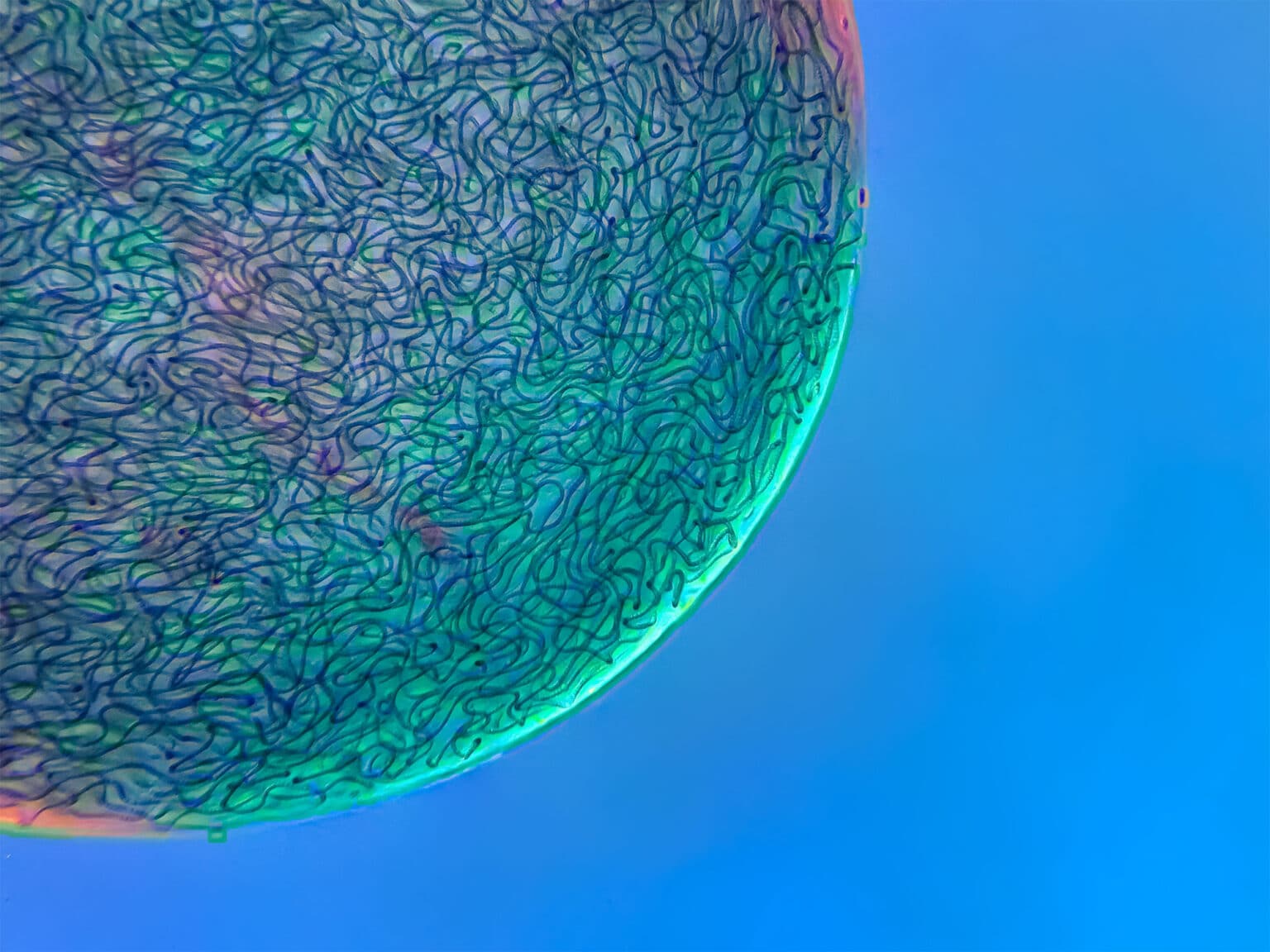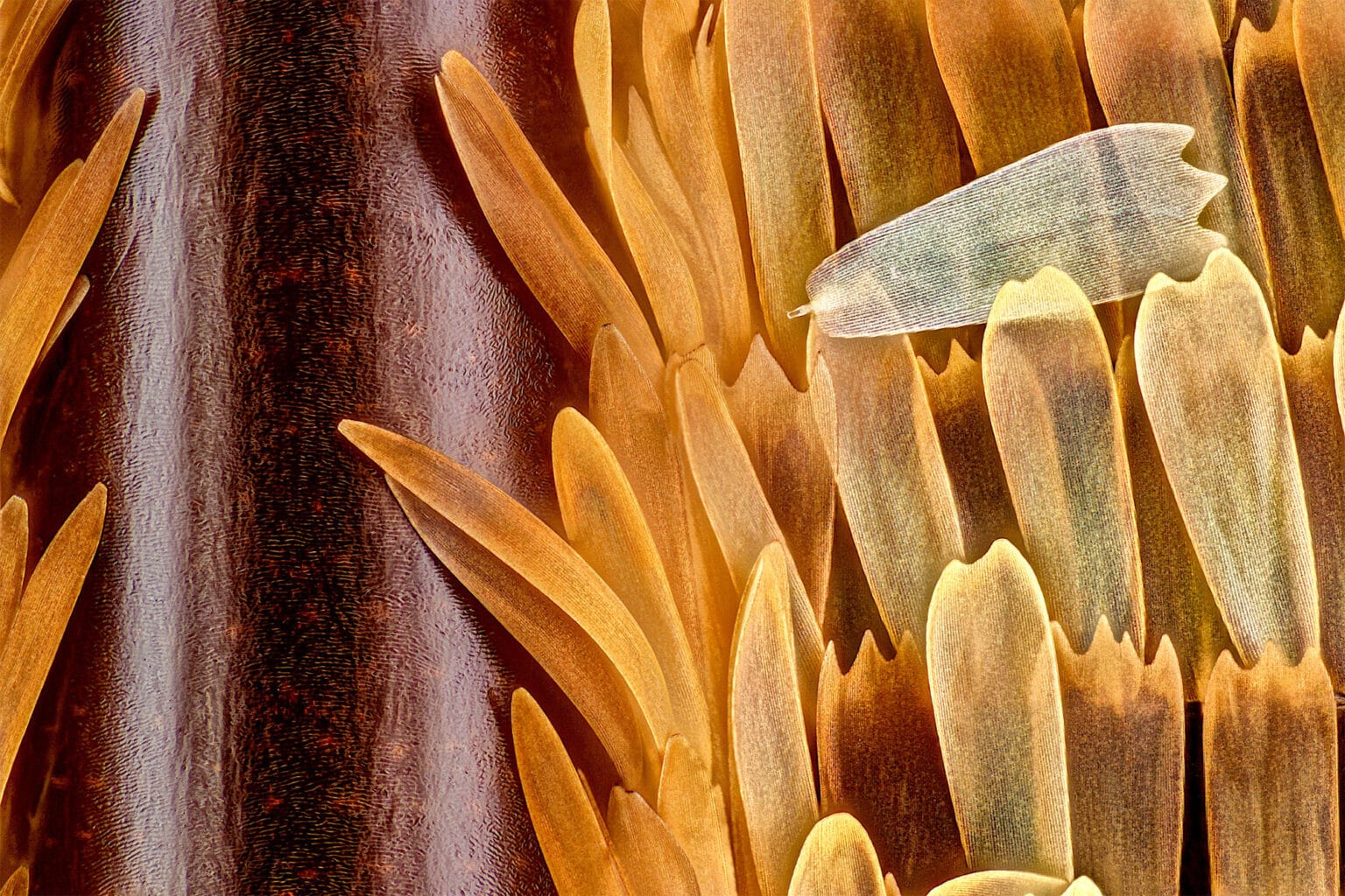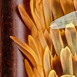 « L’aspect éclairage était compliqué », a déclaré Jason. « Les objectifs des microscopes sont petits et ont une profondeur de champ très faible. Je ne pouvais pas simplement coller une lampe géante à côté du microscope et faire en sorte que l’éclairage soit directionnel. Ce serait comme essayer d’éclairer la tête d’une épingle avec une source lumineuse de la taille de votre tête. Presque impossible. » Jason a modifié la température et la teinte des couleurs en post-production pour mieux illustrer les différents éléments représentés. Son travail illustre parfaitement le processus complexe qui traverse la pratique de la microphotographie tant en amont qu’en post-production.