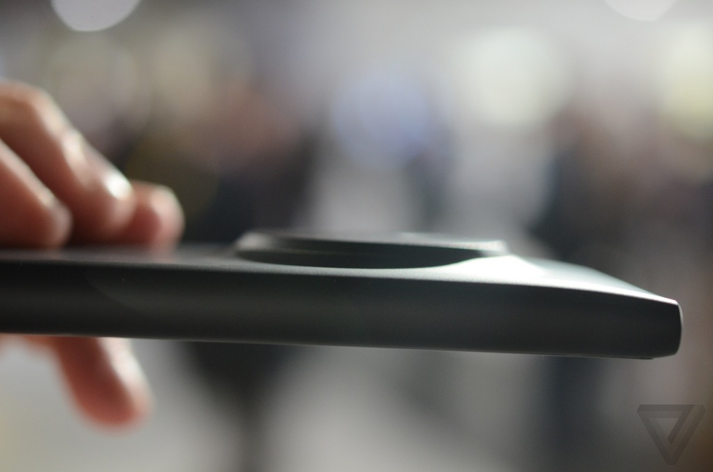 La prise en main, tout d’abord. Les Lumias ne sont pas réputés pour être des petites créatures, entre leur épaisseur conséquente et leur poids qui en a calmé plus d’un. Si le 1020 est annoncé comme 30 grammes plus léger que le 920 et un poil plus petit, il faudra le prendre pour en juger en réalité, sans oublier l’excroissance au dos de l’appareil, dédiée à la partie photo, qui rajoute de l’épaisseur. En attendant, gardons bien ses mensurations en tête : 130.4 x 71.4 x 10.4 mm pour 158 grammes.