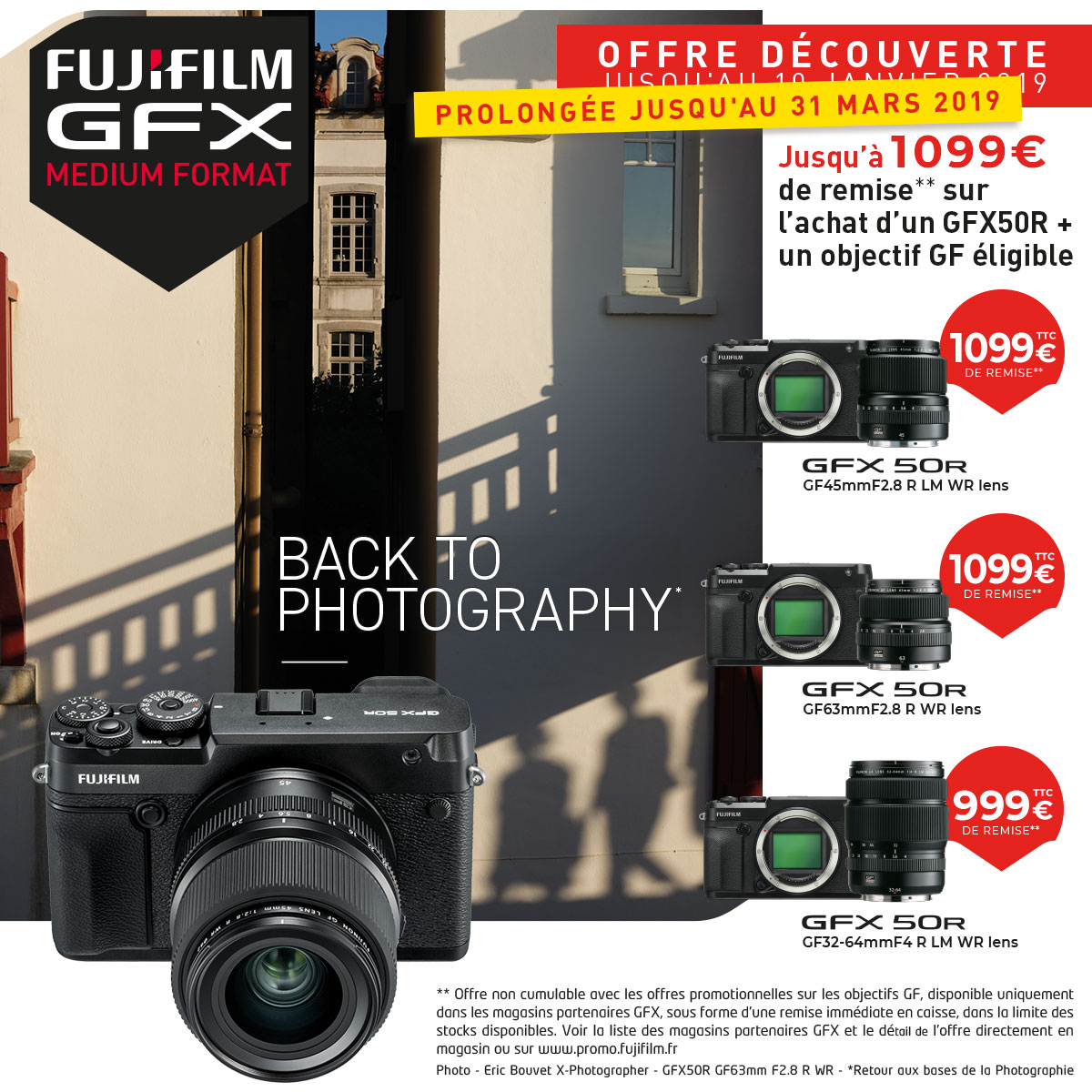 Cette offre est cumulable avec la remise immédiate de 500 € que propose Fuijifilm pour tout achat d’un GFX 50S ( 300 € pour l’achat d’un GFX 50R ) et de la reprise simultanée d’un appareil photo numérique moyen-format ou plein format. Idem pour la remise de 339 € pour l’achat d’un grip VG-GFX.