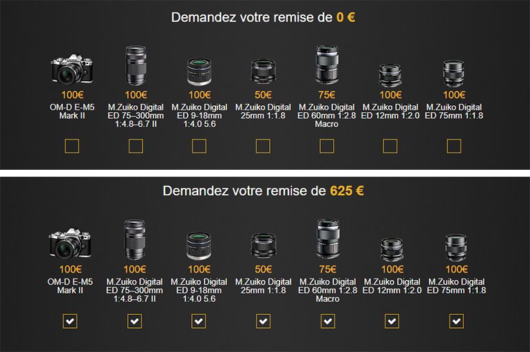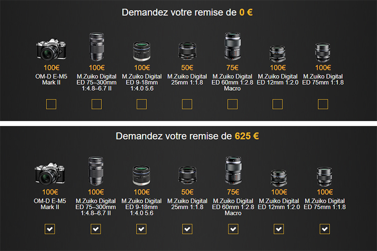 Olympus a mis un petit outil en ligne qui permet de simuler son remboursement. Il suffit de cocher parmi les 7 éléments concernés par la réduction pour savoir quelle réduction totale vous obtiendrez.