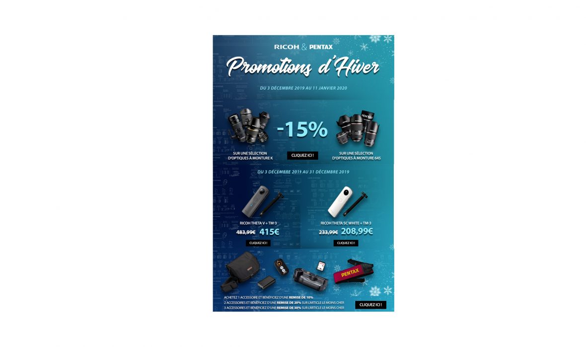 Ricoh Pentax a attendu pour annoncer ses offres spéciales de fin d’année. Depuis le 3 décembre et jusqu’au 11 janvier 2020, il est ainsi possible de bénéficier de remises intéressantes.