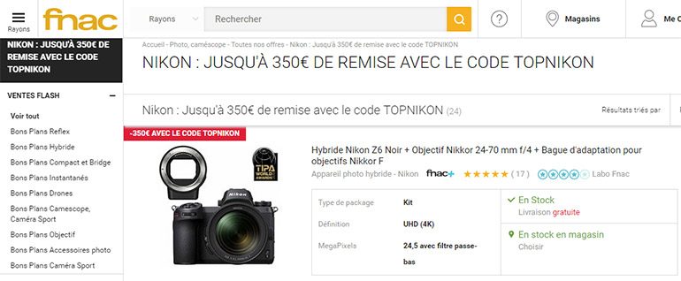 Sur la boutique photo Nikon, il vous faudra par contre entrer un code propre spécifique à la réduction, comme NIKONDAYS350 par exemple.