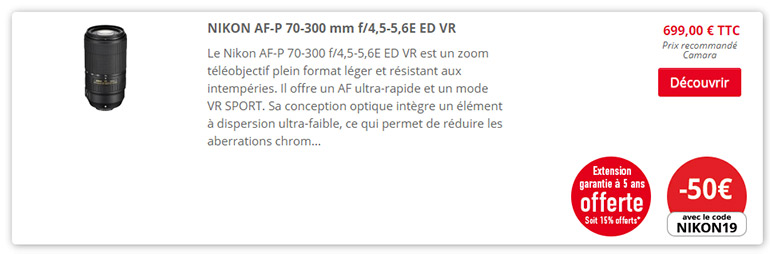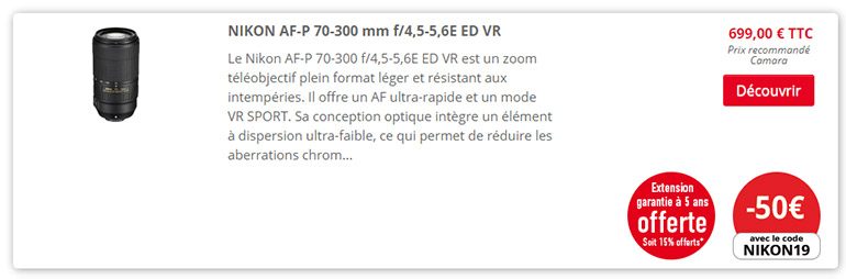 - NIKON AF-P 70-300 mm f/4,5-5,6E ED VR : 50 € de remise immédiate