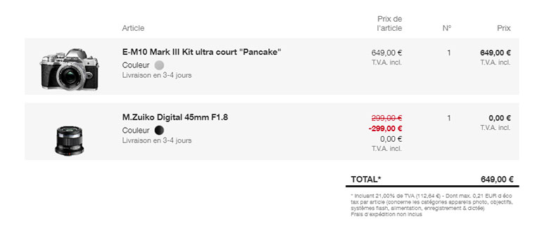Pour y accéder, il vous faudra, comme les autres promotions sur cette page, passer par le webshop Olympus. La réduction est valable sur tous les kits. Comme pour les offres précédentes, la réduction est clairement indiquée sur le site. Il vous suffit de mettre votre produit dans le panier, et de le commander au nouveau prix indiqué pendant la période promotionnelle.