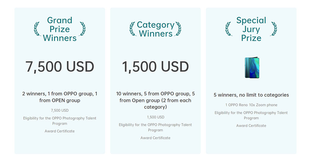 Au total, c’est une somme de 30 000 $ qui sera distribuée aux deux gagnants des Grand Prix des groupes Oppo et Open, ainsi qu’au dix lauréats des cinq catégories de chaque groupe. En sus, cinq photographes se verront remettre un Prix Spécial du Jury et remporteront un smartphone Oppo Reno 10x Zoom. Tout ce beau monde aura également le privilège de participer à l’Oppo Talent Photography Program, une masterclass encore quelque peu nébuleuse mais sensée être animée par des « photographes de renommée mondiale ».
