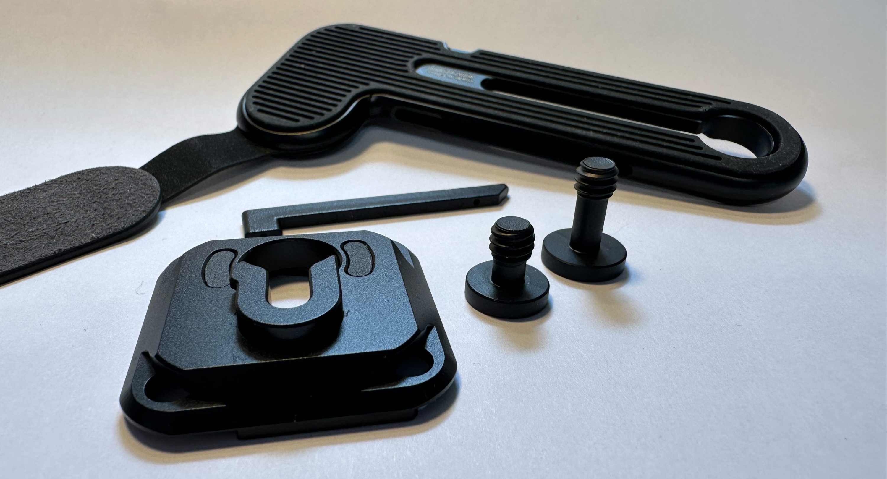Le Peak Design Micro Clutch se présente comme une petite sangle rembourrée qui s’attache du côté de la poignée de l’appareil photo (le droit). Le système se compose de cette sangle, mais aussi d’une plaque métallique à laquelle une des extrémité de la sangle vest fixée avec un axe pivotant pour assurer un bon positionnement et un bon confort.. Le Micro Clutch se décline en deux tailles, pour s’adapter au plus près de celle de l’appareil photo numérique auquel elle se destine. Une version avec une plaque en forme d eL pour les plus grand, et une avec une plaque en forme de I sans retour pour les plus compact. Travaillant avec un Panasonic Lumix S5, nous avons opté pour le « grand modéle » en forme de L.