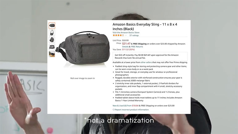 Le début de la vidéo montre à quel point les deux sacs, qui portent exactement le même nom (Everyday Sling), se ressemblent. Mais le commentaire va direct droit au but en expliquant qu’avec le modèle Amazon, vous n’avez pas besoin de payer pour toutes ces choses inutiles que sont par exemple la recherche et le développement, la certification Bluesign, la certification B Corp, ou encore la garantie à vie, ou encore la neutralité carbone.