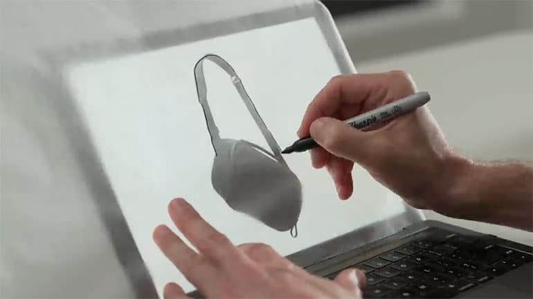 La vidéo devient plus humoristique lorsqu’est met en scène une équipe de designers d’Amazon, utilisant du calque pour copier l’original, remplaçant les matériaux nobles par les plus basiques, et, apothéose, en trouvant un nom génial : Everyday Sling.