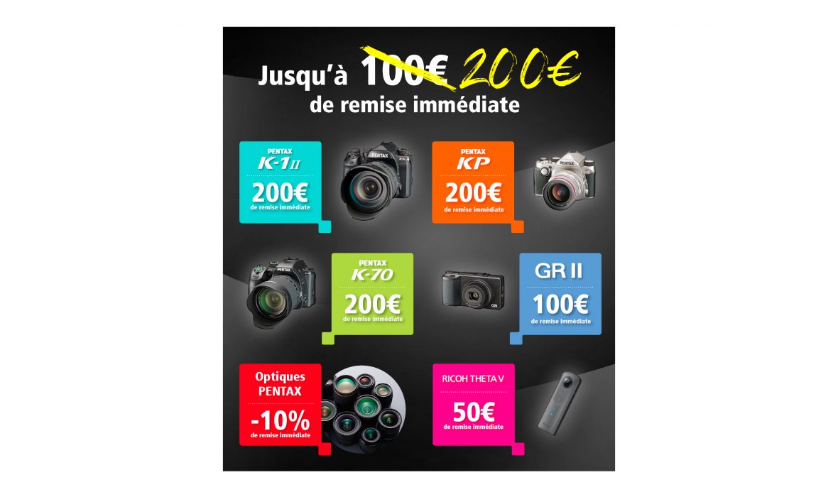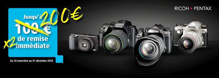 Pentax annonce le doublement de son offre de remise en caisse valable jusqu’au 31 décembre 2018. Au lieu de 100 € maximum, c’est donc jusqu’à 200 € qui pourront être économisés sur votre prochain achat.