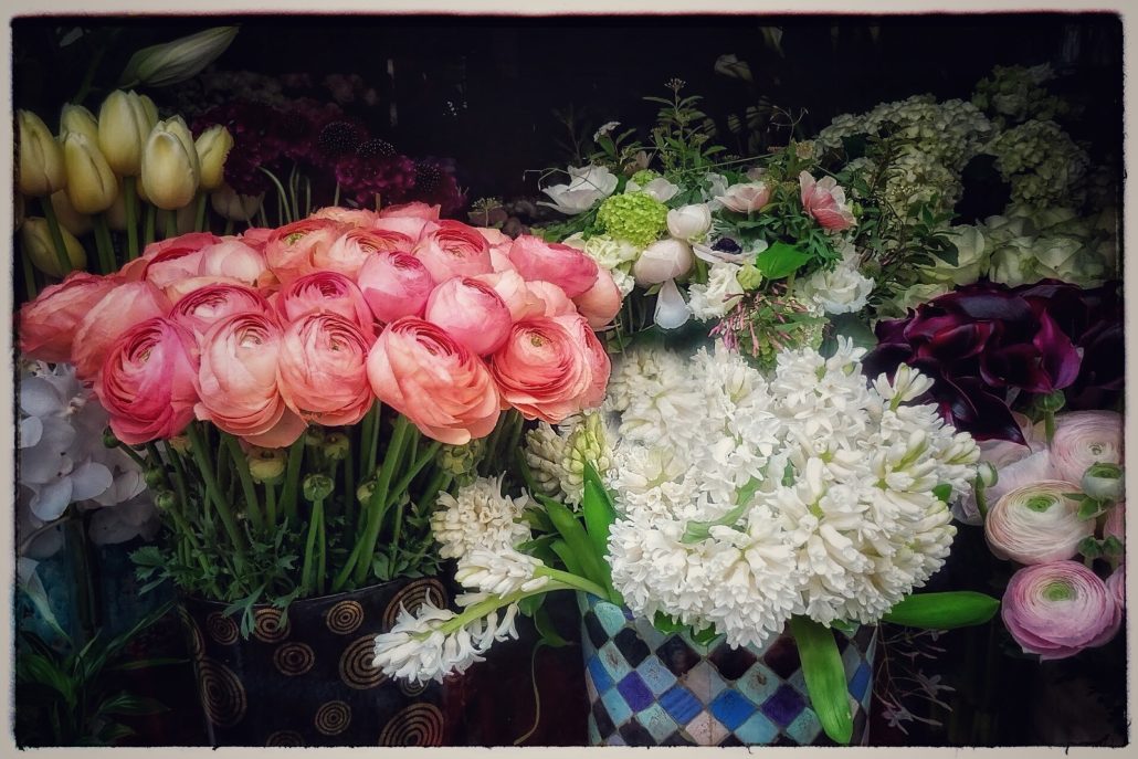 Fleurs dans la vitrine d’un fleuriste, Paris.
