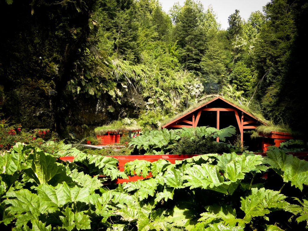 Il l’est. Ce sont des termes placés au creux d’une montagne sur une cascade. L’architecte à volontairement peint tous les bois en rouge pour contraster avec le vert. Vive le Chili 🙂