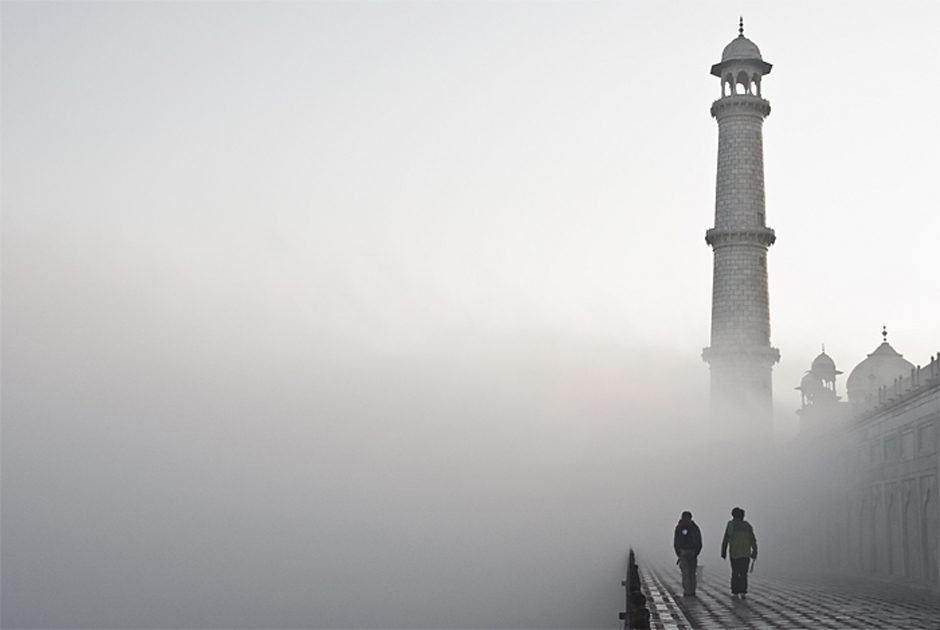 Enfin un angle de vue original pour le Taj Mahal. Belle atmosphère par ailleurs.