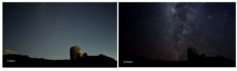 En plus de combiner plusieurs dizaines de photos en longue pose, les algorithmes opèrent un traitement différent des différentes zones de l’image. Les réglages nécessaires pour voir parfaitement les étoiles auraient tendance à surexposer tout ce qui se situe devant.