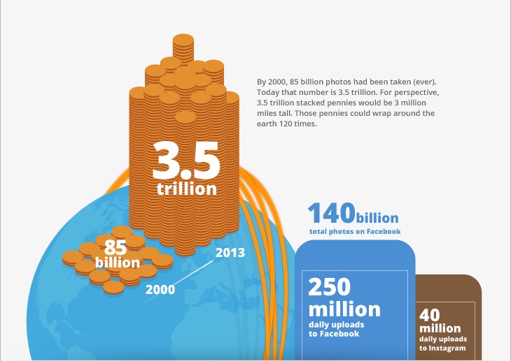 Facebook a changé la donne : la photo devient un moyen de renseigner visuellement son entourage de ses habitudes de consommation, de ses activités. D’où cette allégorie avec des pièces qui illustre parfaitement l’explosion du contenu et la banalité de son propos.