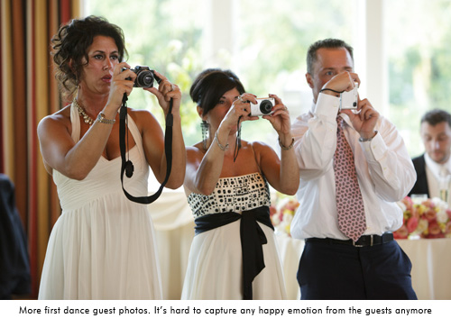 Richard Esposito, photographe de mariage, met les pieds dans le plat sur le blog Tiffinbox en évoquant l’émergence de ce nouveau type de photographes, l’ère digitale qui rend le travail des professionnels beaucoup plus difficile. En cause, ces nombreux appareils qui viennent se loger à des moments stratégiques pour le photographe : lorsque la mariée et son père se dirigent vers l’autel, au moment de découper le gâteau, la première danse, etc.