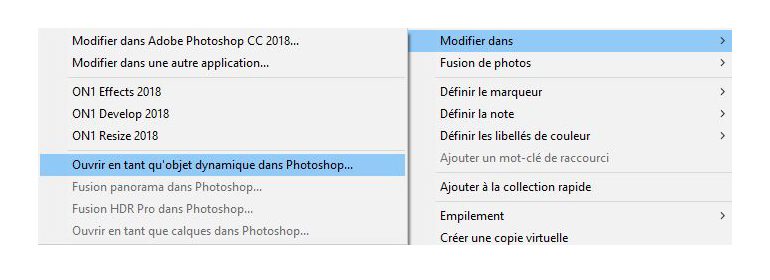 Il existe une solution manuelle qui fonctionne très bien pour convertir vos presets et les utiliser dans photoshop, que ce soit sur Windows ou Mac. Elle consiste à effectuer un clic droit depuis Lightroom sur le fichier auquel vous avez préalablement appliqué votre réglage, puis à cliquer sur “Modifier dans”, puis sur “Ouvrir en tant qu’objet dynamique dans Photoshop”.