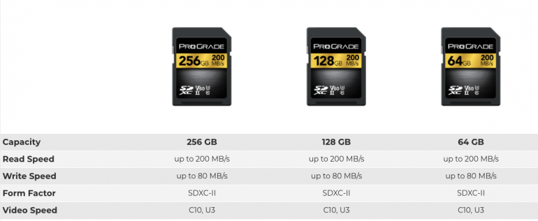 ProGrade Digital fournit pour l’instant une gamme limitée de cartes pour commencer, ainsi qu’un lecteur de cartes. L’objectif est de fournir un parfait compromis entre performances de haut niveau et des prix compétitifs. Le site met plus en avant ses cartes CFast 2.0, les plus performantes, mais propose aussi des cartes mémoire SDXC UHS-II.