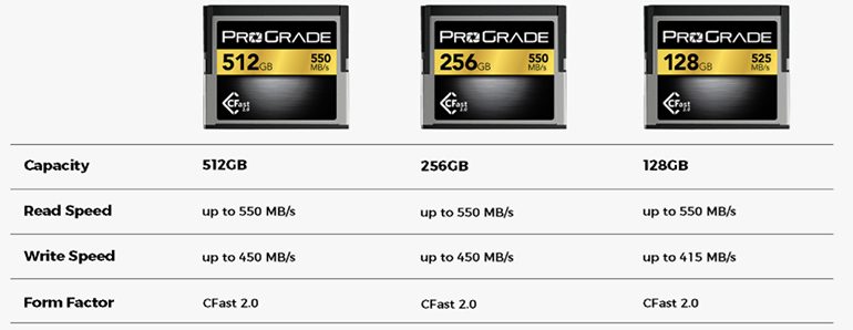 Les trois premières cartes CFast 2.0 de ProGrade Digital proposent des capacités de stockage de 128, 256 et 512 Go. Elles répondent au standard VPG130 qui signifie qu’elles peuvent soutenir une vitesse d’écriture continue de 130 Mo / seconde minimum. Ce niveau de performance permet une utilisation en vidéo avec des débits très importants, idéal donc pour les professionnels.