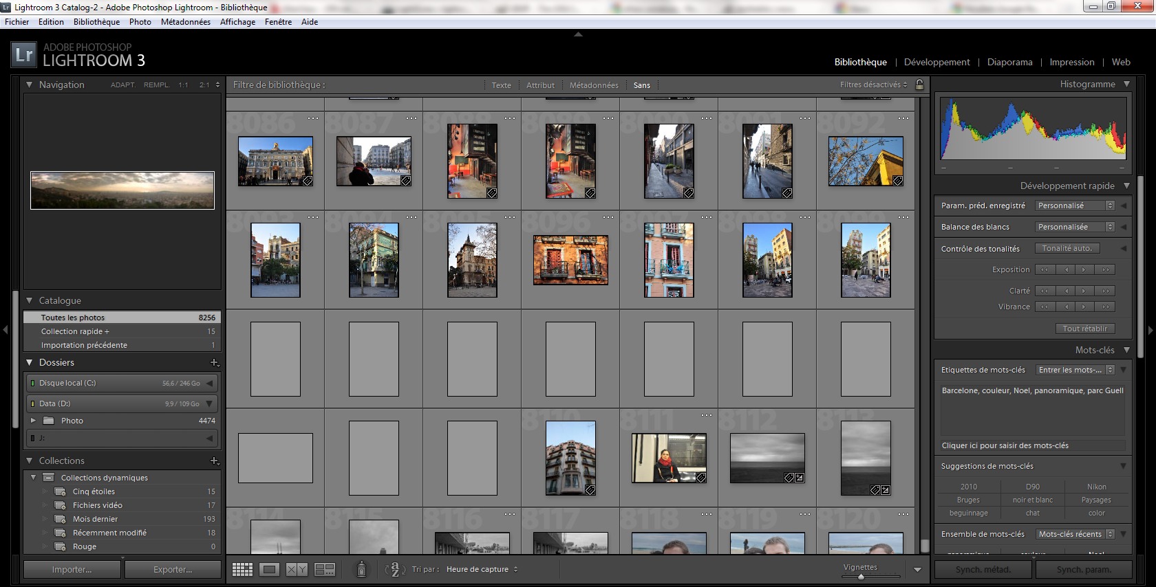 Je vous ai déjà parlé de ce logiciel, essentiellement pour présenter la section développement mais, Lightroom est un logiciel qui englobe totalement le workflow du photographe. Dès l’importation, il permet de créer et de gérer des catalogues, des collections, des collections dynamiques. Les metadatas sont aussi plus évoluées que dans Picasa ou iPhoto : outre les tags que l’on peut associer à une photo, on peut la noter (de 0 à 5), la marquée (acceptée/rejetée) ou encore affecter une marque de couleur. Ces metadatas sont particulièrement utiles lorsqu’on veut trier et retrouver facilement certaines photos.