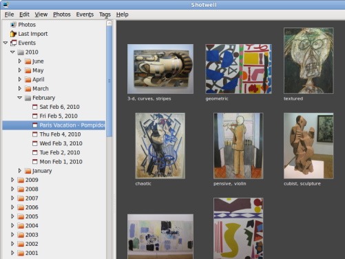 Du côté du monde libre, c’est shotwell, présent dans la distribution Ubuntu depuis la version 10.10 qui est le gestionnaire de photos. Les fonctionnalités de ce logiciel sont plus réduites que pour les deux autres. La gestion des photos est chronologique (abrorescence sous la forme année/mois/jour). Il ne gère pas les raws ni la reconnaissance faciale.