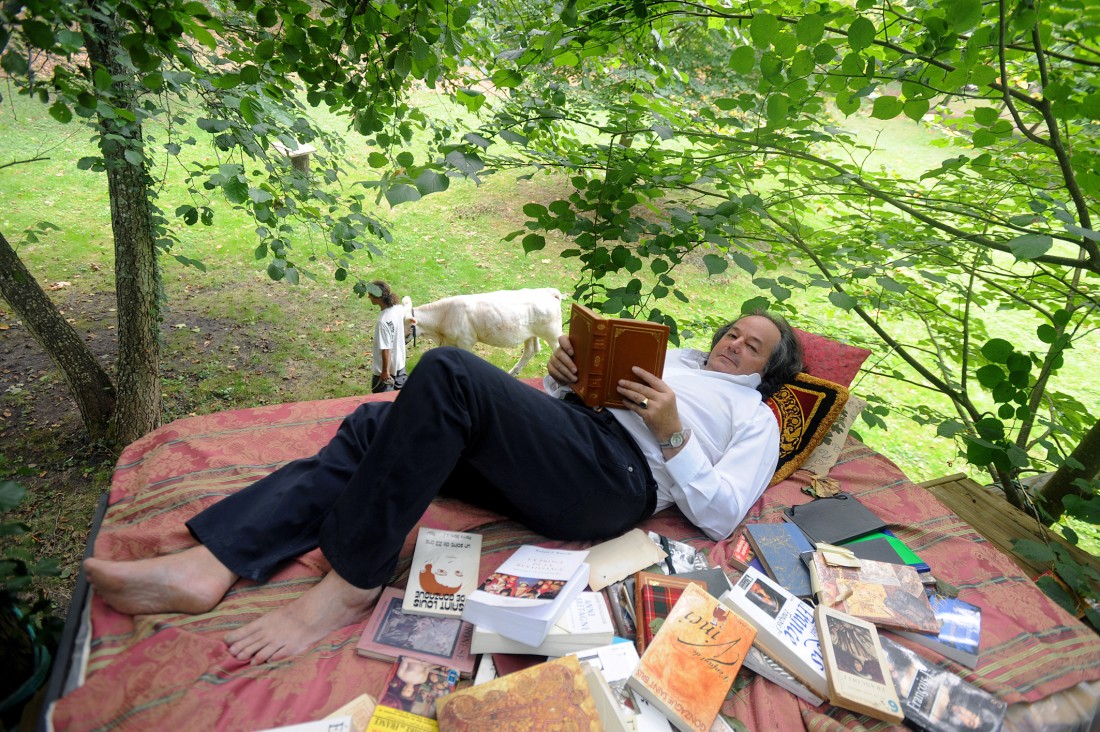 Séance de lecture improvisé pour Gonzague de Bris à la Forêt des Livres, en plein lecture de 27 livres