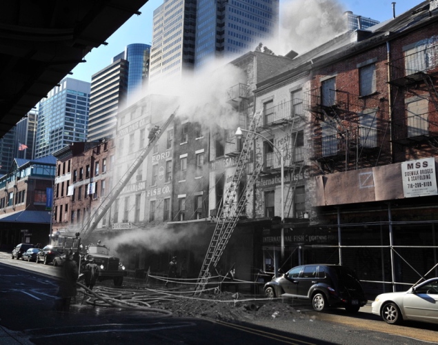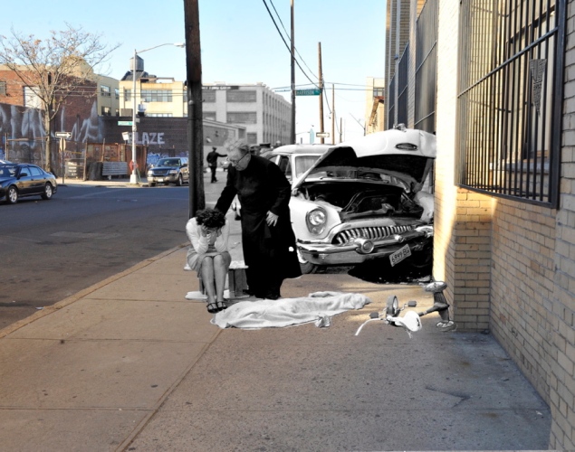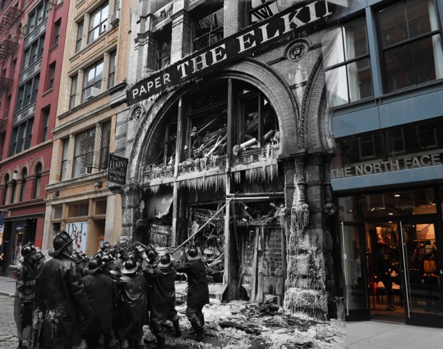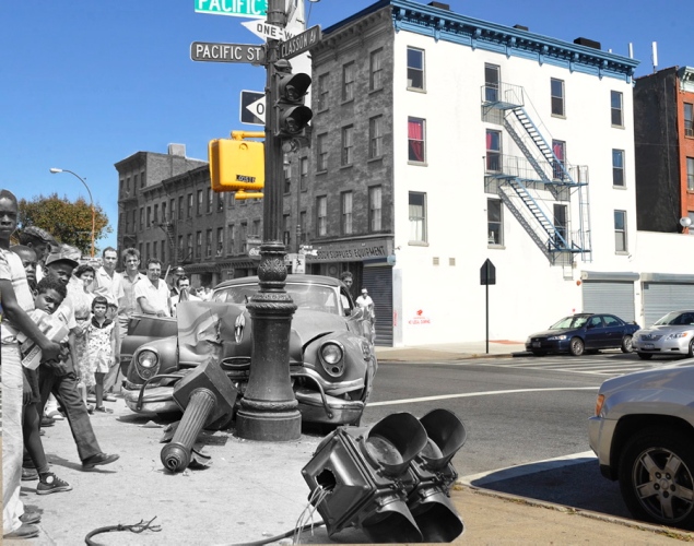 On assiste alors aux scènes d’un incendie sur Fulton Fish Market en 1961, à la crise de nerfs d’une femme face à des policiers au 497 Dean St. Brooklyn, d’ une sombre histoire de jalousie qui finit mal dans le Bronx, de la tôle froissée à l’angle de Pacific St. et Classon Ave en passant par à un banal accident de tricycle dans le Brooklyn de la fin des années 50 et au spectaculaire incendie dans le sud de Manhattan qui ravagea la boutique de papier The Elkins Paper & Twine Co. 1958, dans le sud de Manhattan. The North Face, la boutique sur la droite, n’avait alors pas été inventée. Un étrange ballet passé-présent qui nous plonge dans un New York sombre.