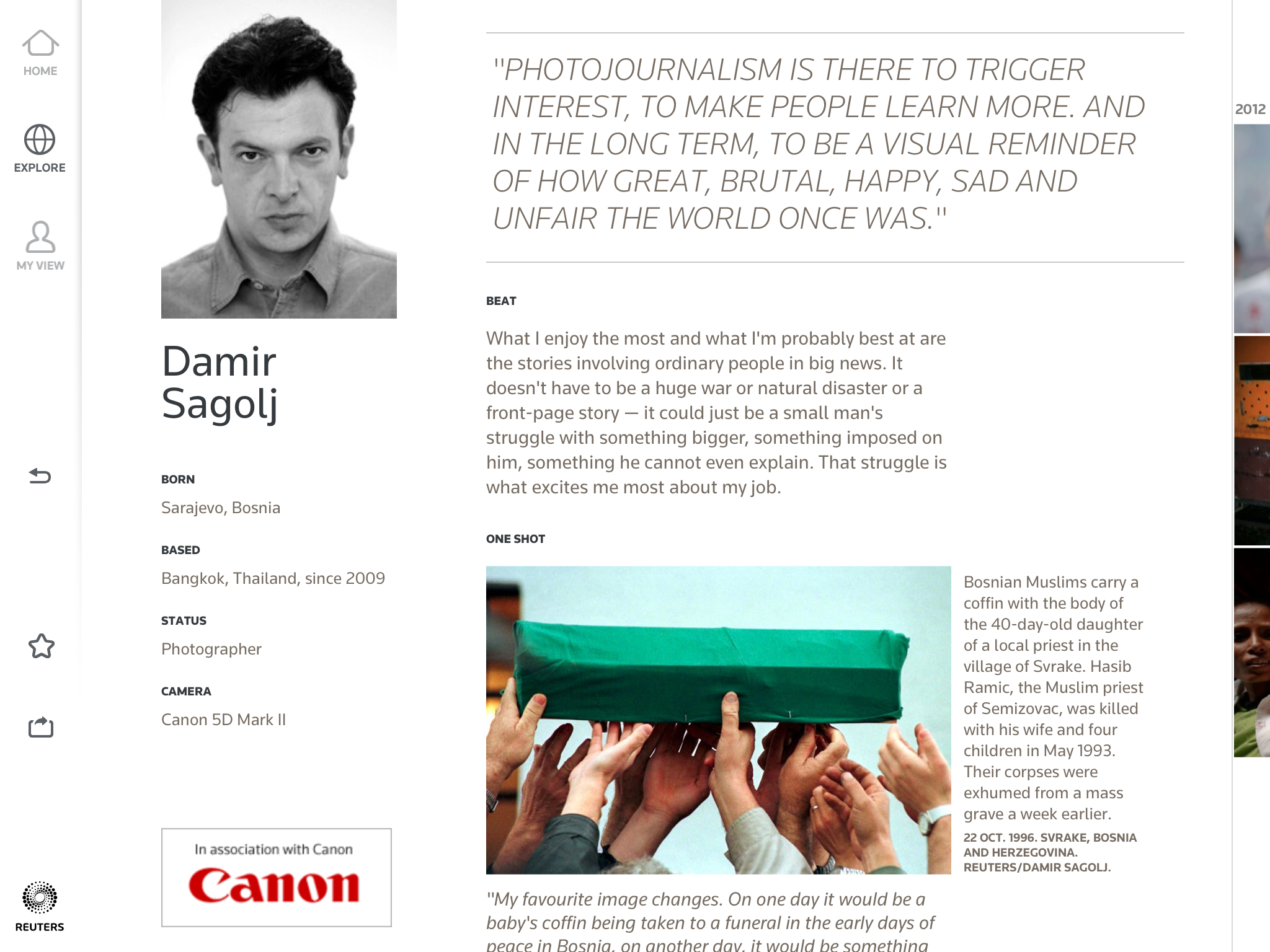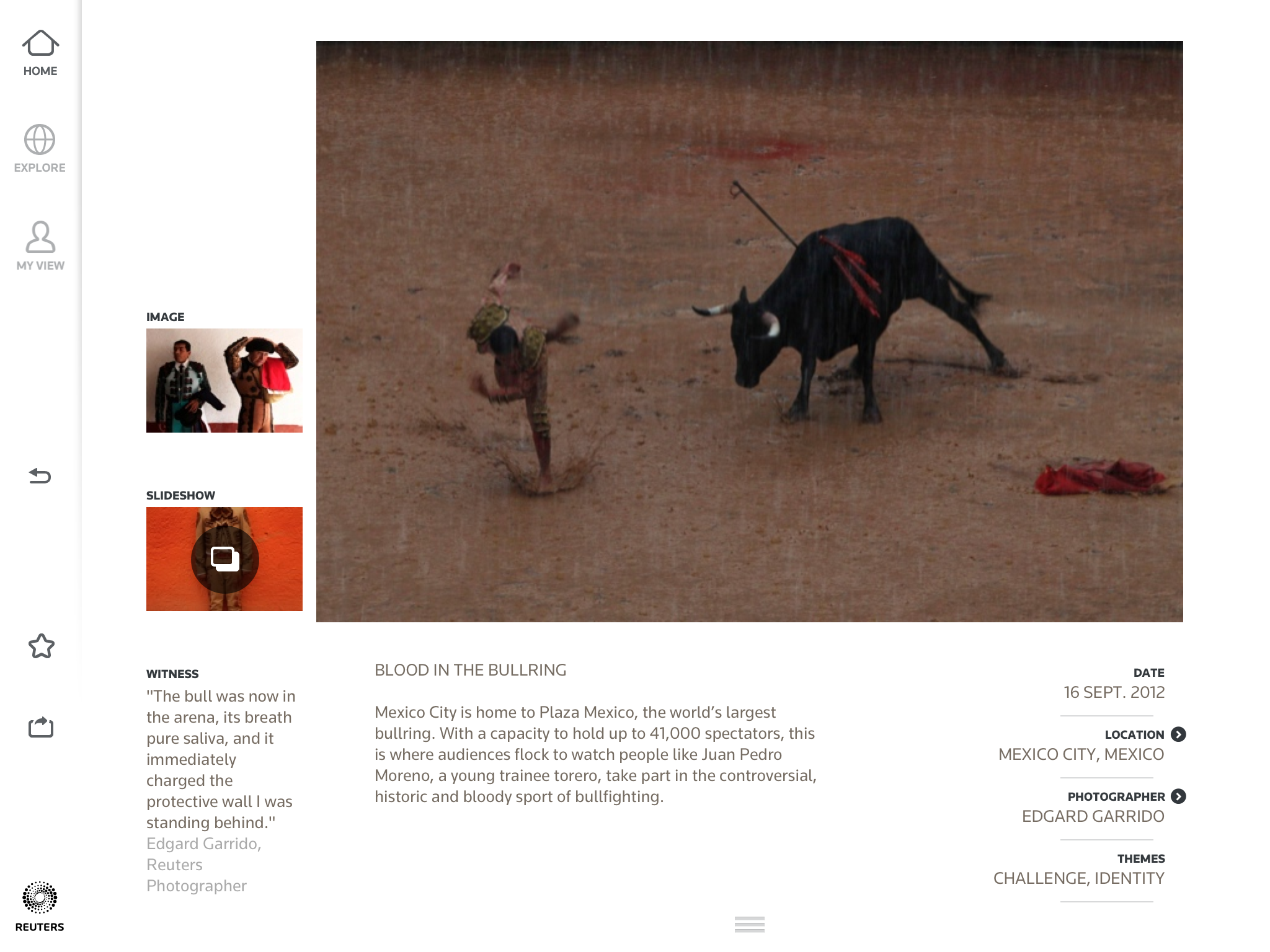 Pour les amoureux de belles images Reuters lance The Wider Image, une application uniquement destinée à l’iPad et proposant chaque jour une poignée d’histoires interactives. En images, sons et vidéos, le photojournalisme au creux de ses mains.