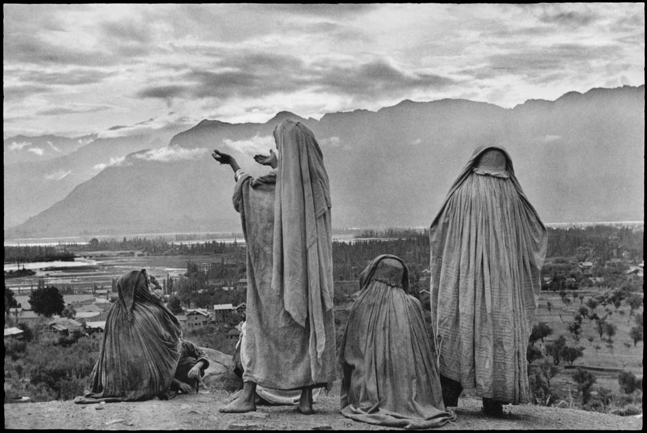 INDIA. Kashmir. Srinagar. 1948. Femmes musulmanes au sommet de Hari Parbal Hill, priant devant le lever de soleil sur l'Himalaya