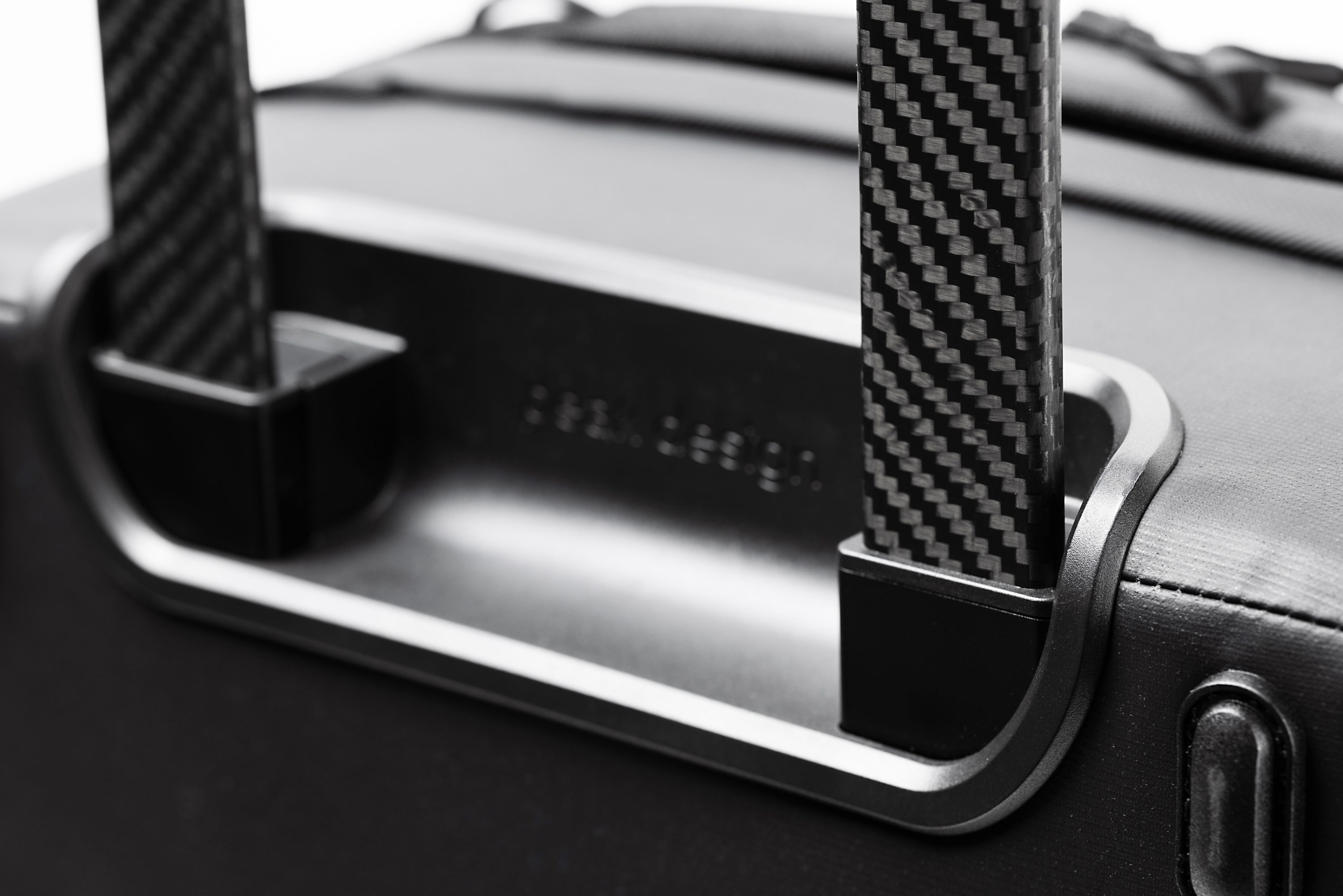 Contrairement aux poignées télescopiques en aluminium standard, qui laissent de grands espaces inutilisés au fond des valises traditionnelles, la poignée du Roller Pro est fabriquée en fibre de carbone plate monobloc. Une matière qui doit la rendre plus rigide tout en occupant seulement un tiers du volume habituel. Cela maximise l’espace de rangement et améliore l’ergonomie du bagage.