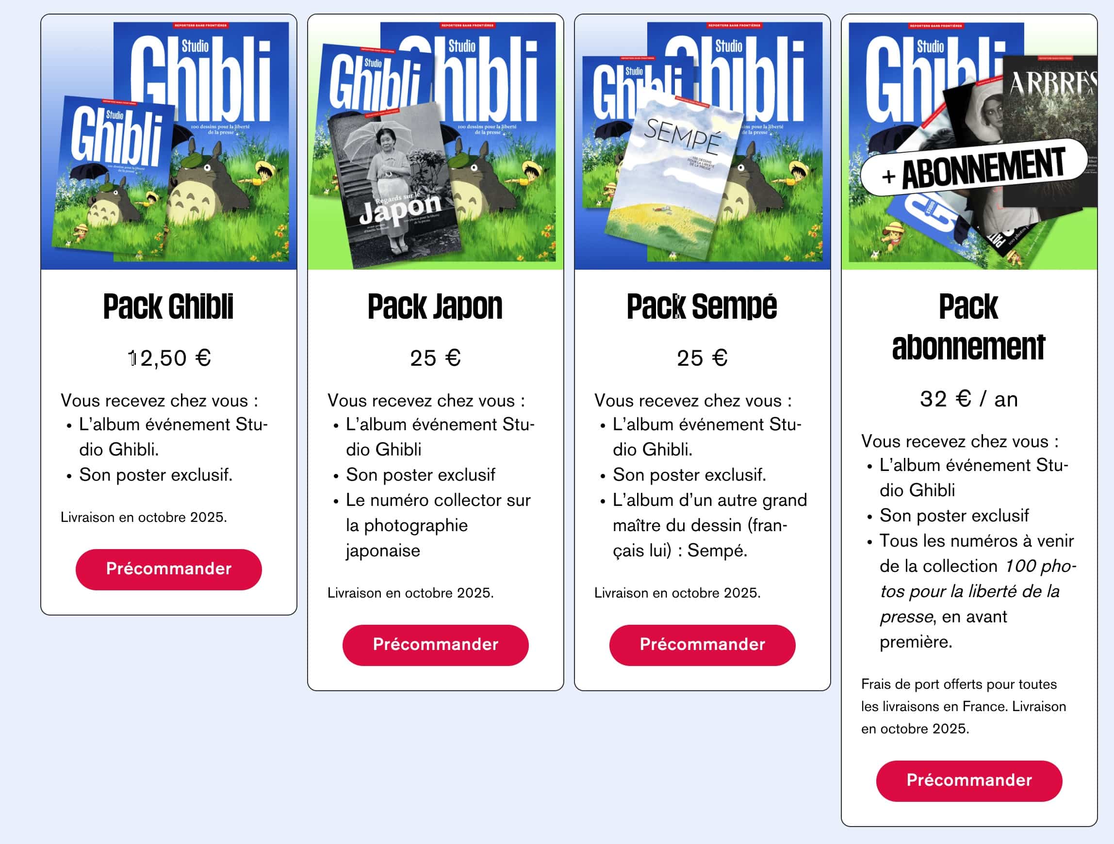 En 2025, le Studio Ghibli et Reporters Sans Frontières fêtent leurs 40 ans. L’occasion parfaite pour une collaboration autour d’un album : 100 photos/dessins pour la liberté de la presse. Soutenez la liberté de la presse et faites-vous plaisir en participant à la campagne de préventes de cet album !