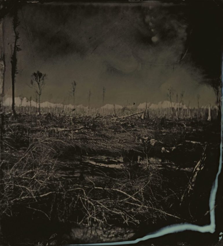 Ces photographies prises entre 2008 et 2012, exploitent le négatif au collodion, une ancienne technique qui remonte à la fin du XIXème siècle. Elles dévoilent des marécages frappés par les feux : le paysage en devient fantomatique, inquiétant, et assume des airs de cimetière abandonné.