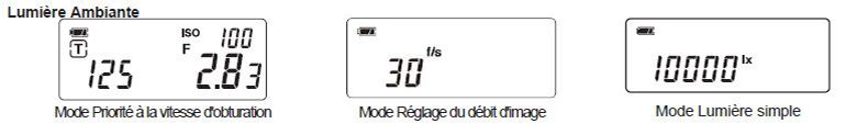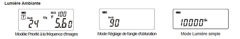 Dédié à la vidéo, ce mode de mesure de la lumière ambiante permet d’accéder à la priorité T (priorité à la vitesse d’obturation), au mode Lux/Fc. On pourra aussi sélectionner la fréquence d’images, et obtenir la valeur d’ouverture adaptée pour une exposition parfaite.