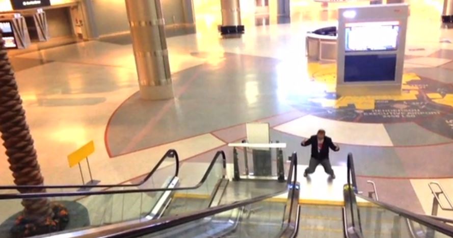 Véritable MacGyver, Richard Dunn a utilisé les moyens du bord pour créer cette vidéo : A l’aide de son iPhone fixé par du rouleau de scotch pour marquer les bagages, il a utilisé sa valise à roulette, des pancartes et des escalators, pour ses travelings maison.