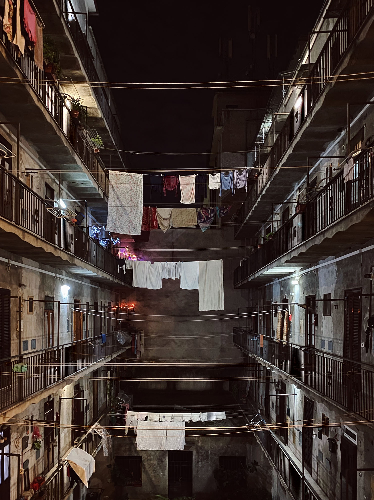 Une composition superbement équilibrée qui suscite énormément de questionnements chez le spectateur. Où sommes-nous ? Qui habite ces appartements ? Et surtout : pourquoi faire sécher son linge alors qu’il fait nuit ? Ce qui m’attire en tant que photographe d’architecture, c’est la perspective à un point de fuite qui entraîne le spectateur à l’intérieur du cadre, et attire son regard directement vers ces vêtements étendus.