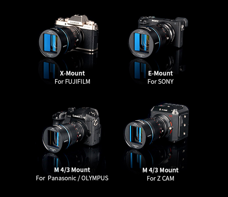 Sirui a développé son modèle en 4 types de montures : la monture X de Fujifilm, la monture E de Sony, et la monture M 4/3 pour Olympus et Panasonic, et monture M 4/3 pour Z CAM.