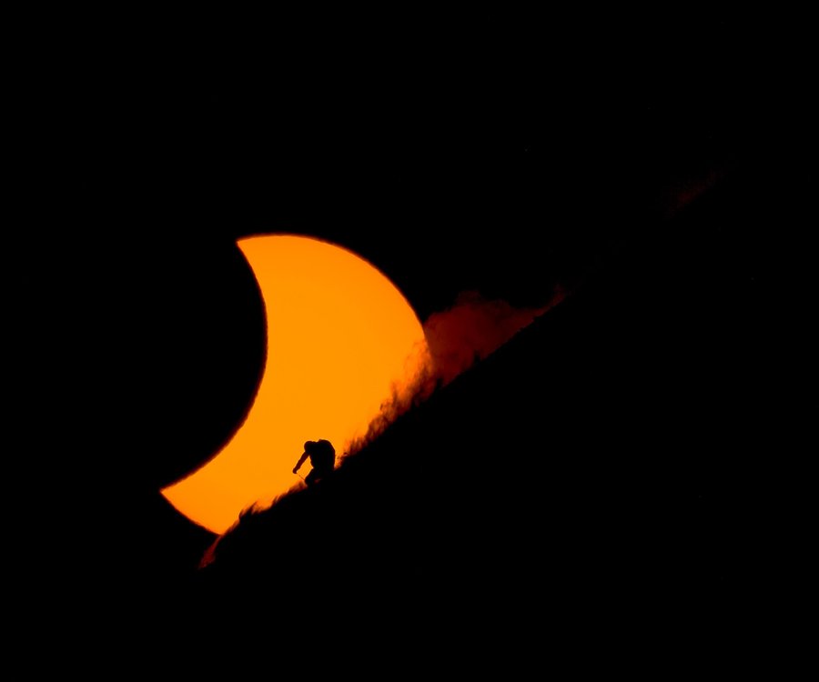 Reuben Krabbe s’est lancé un pari osé : en compagnie des skieurs Brody Leven, Cody Townsend et Chris Rubens il a décidé d’immortaliser une session durant une éclipse. Trois mois de préparations, deux semaines de repérages, 2.5 minutes de ténèbres, voici un véritable défi gagnant. Le tout à été capturé à Svalbard, un archipel de la Norvège situé à la limite de l’océan Arctique et de l’océan Atlantique et Reuben Krabbe et son appareil étaient alors postés à 1.5 km des skieurs.