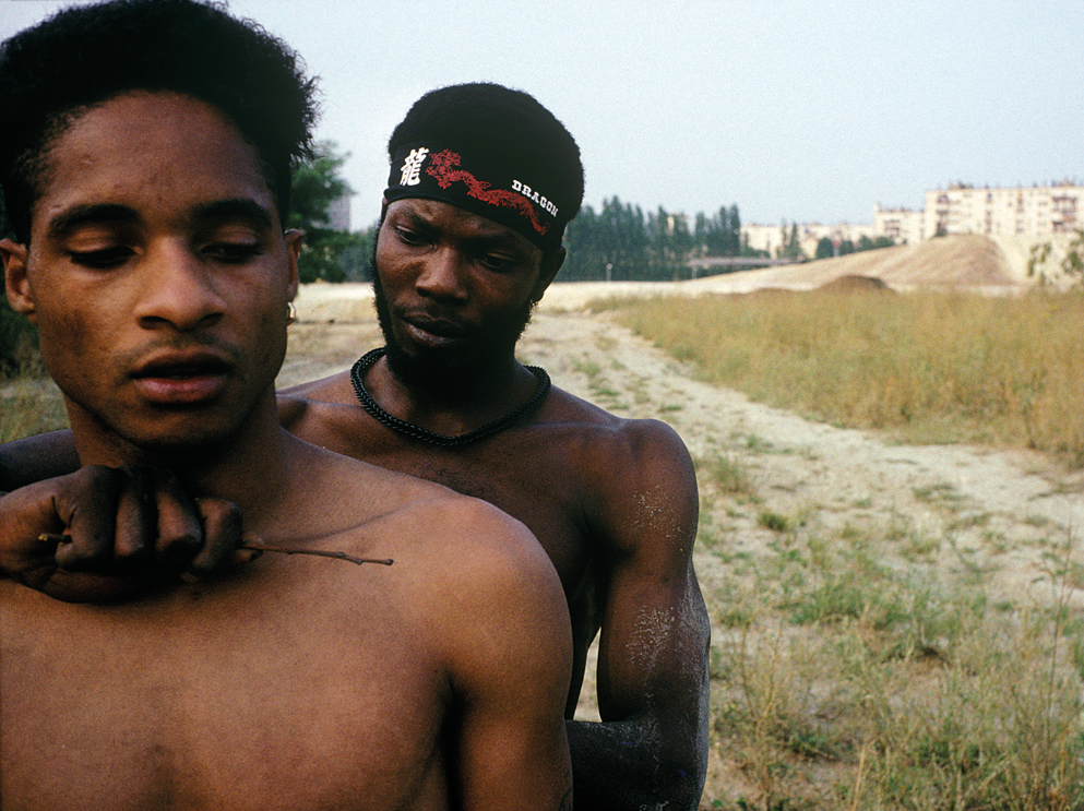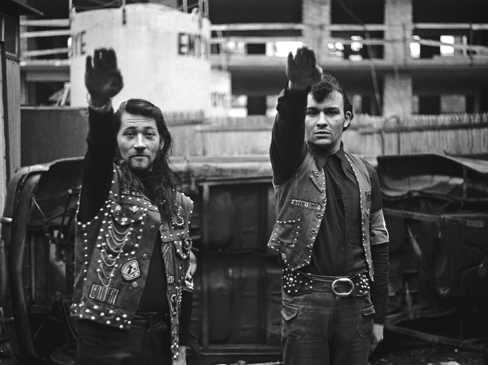 Face aux agressions, ceux qui sont visés en premier lieu par les skins s’organisent en gangs. Yves, dit « le Vent », fonde les Black Dragoons en 1983. On le voit ici avec une recrue, à Montreuil, en 1990.