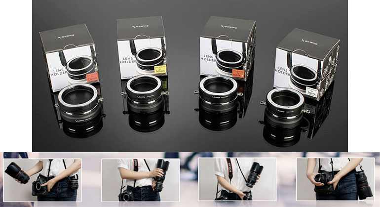 Le Lens flipper est une des solutions les plus simples pour sécuriser le changement d’optiques. En mettant dos à dos ce qui ressemble à des adaptateurs d’optiques, et en y ajoutant une sangle, on obtient une solution intéressante. Elle permet à la fois de transporter une optique à l’épaule, et d’en changer de manière rapide et sécurisante. Il peut supporter jusqu’à 60 kilos de matériel.