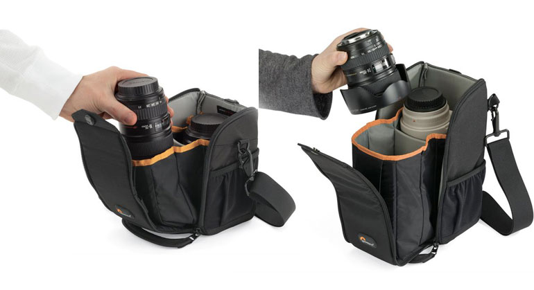 Il existe aussi d’autres solutions comme le Lowepro Lens Exchange, une housse qui s’ouvre pour laisser place à un espace étendu grâce à un soufflet. Dans l’espace principal, on positionne une optique. Lorsqu’on ouvre le sac, le soufflet permet de positionner temporairement l’optique que l’on compte ranger. Une fois l’optique remplacée sur l’appareil, on déplace l’optique placée dans le soufflet vers l’emplacement principal et on referme. Simple et ingénieux.