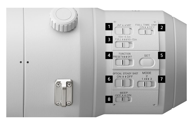 1. Mode de mise au point / 2. Mode DMF permanent / 3. Limitation de la plage focale / 4. Bague de sélection de fonctions / 5. Bouton SET / 6. Compensation des mouvements / 7. Mode de compensation des mouvements / 8. Commutateur BEEP