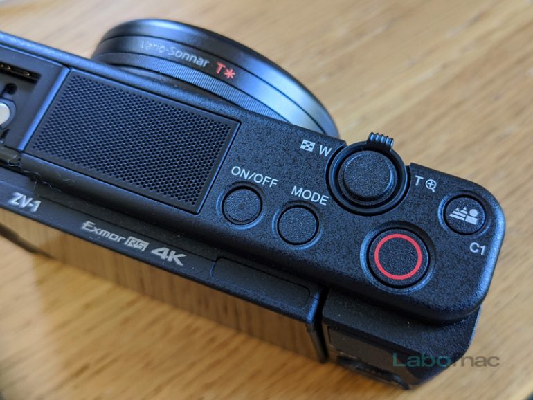 Le bouton dédié à l’enregistrement vidéo situé à l’arrière du RX100 VII déménage sur le ZV-1 au-dessus du produit. Impossible de le manquer, il occupe la place de la molette permettant de naviguer entre les différents modes de prise de vue sur le compact expert. Au-dessus toujours siège une griffe porte-accessoires. Elle sera donc utile à ceux qui souhaitent utiliser un flash (à acquérir séparément) et peut accueillir la bonnette fournie avec l’appareil. Celle-ci sert à atténuer les bruits parasites, tel celui du vent, et à améliorer la captation du micro à trois capsules intégré au boîtier. Plutôt sympathique côté look, même s’il semble plus pertinent d’utiliser un microphone déporté et de réserver la griffe à un éclairage d’appoint.